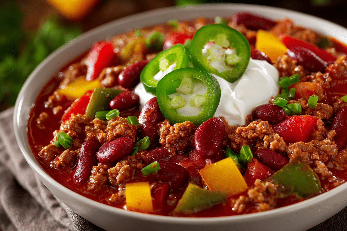 Classic beef chili made with ground beef, beans, tomatoes, and warming spices. A hearty one-pot meal perfect for any season.