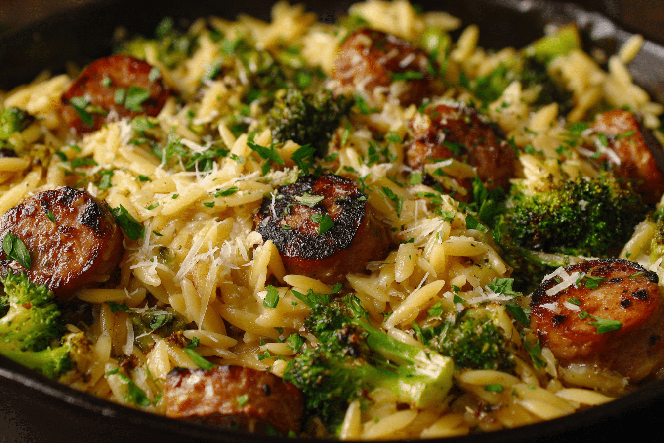 A one-pot dish featuring savory chicken sausage, creamy orzo, and tender broccoli, perfect for weeknight dinners or meal prep.