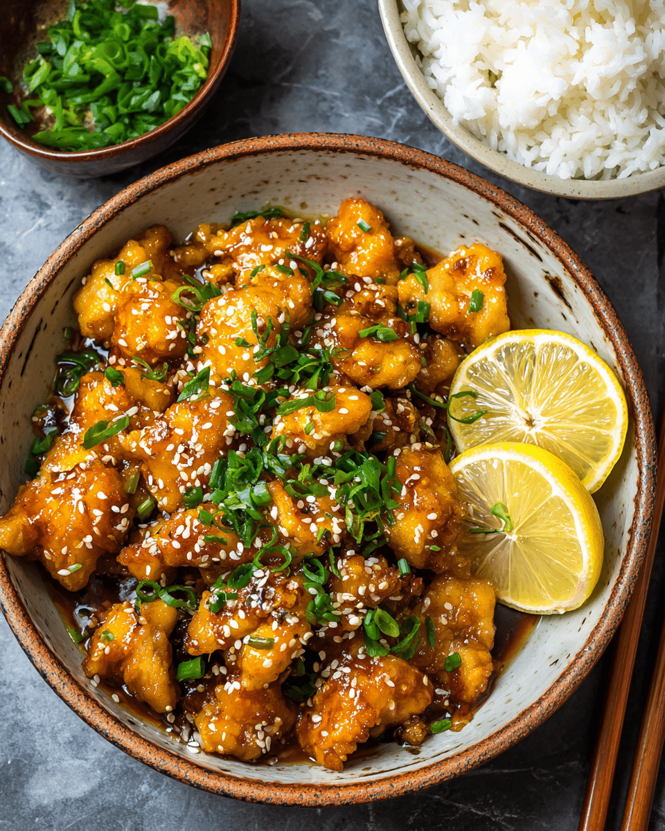 A crispy Chinese-American classic with golden fried chicken and a glossy, sweet-tart lemon sauce. Better than takeout and easy to make at home.