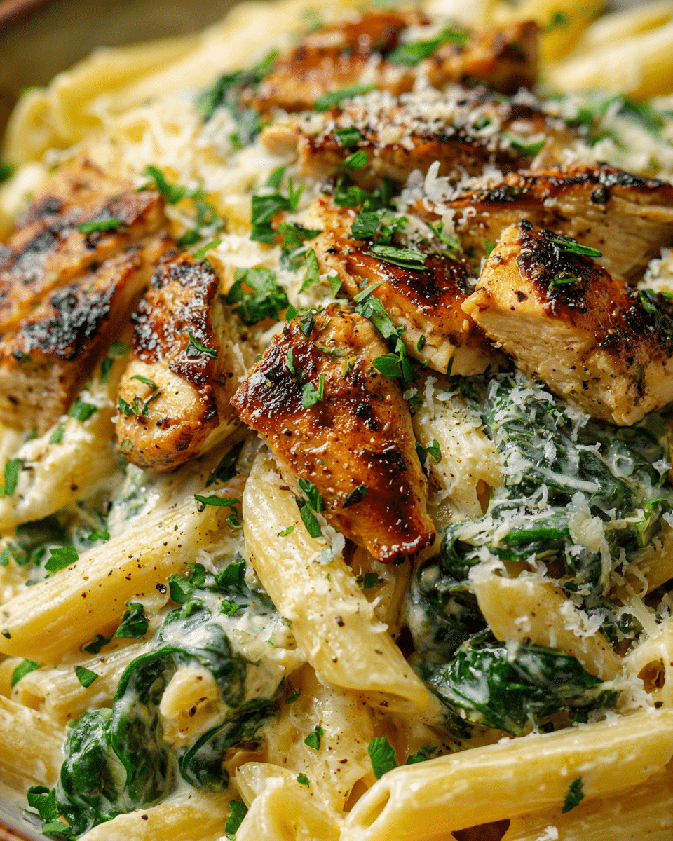 Toss in a few handfuls of baby spinach and stir until wilted (about 1–2 minutes). Add the cooked pasta and sliced chicken to the skillet. Toss everything to coat evenly in the sauce.