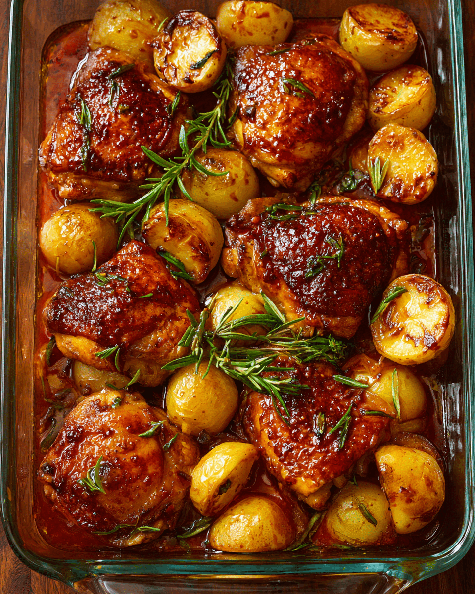 This one-pan chicken thighs and potatoes recipe delivers crispy skin, juicy meat, and golden roasted potatoes, all seasoned with garlic, herbs, and olive oil for a simple yet deeply satisfying meal.