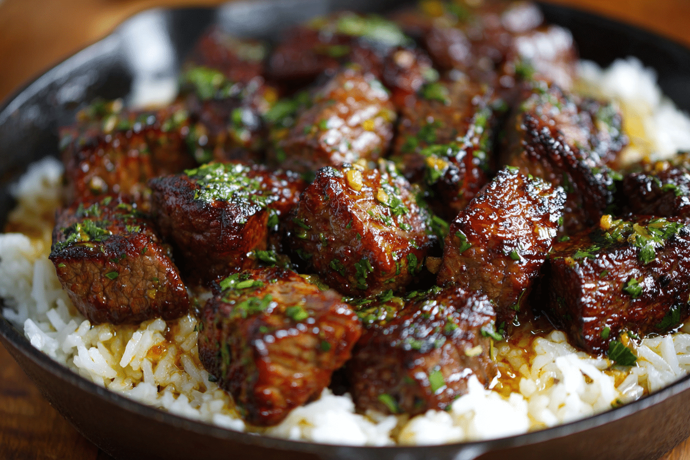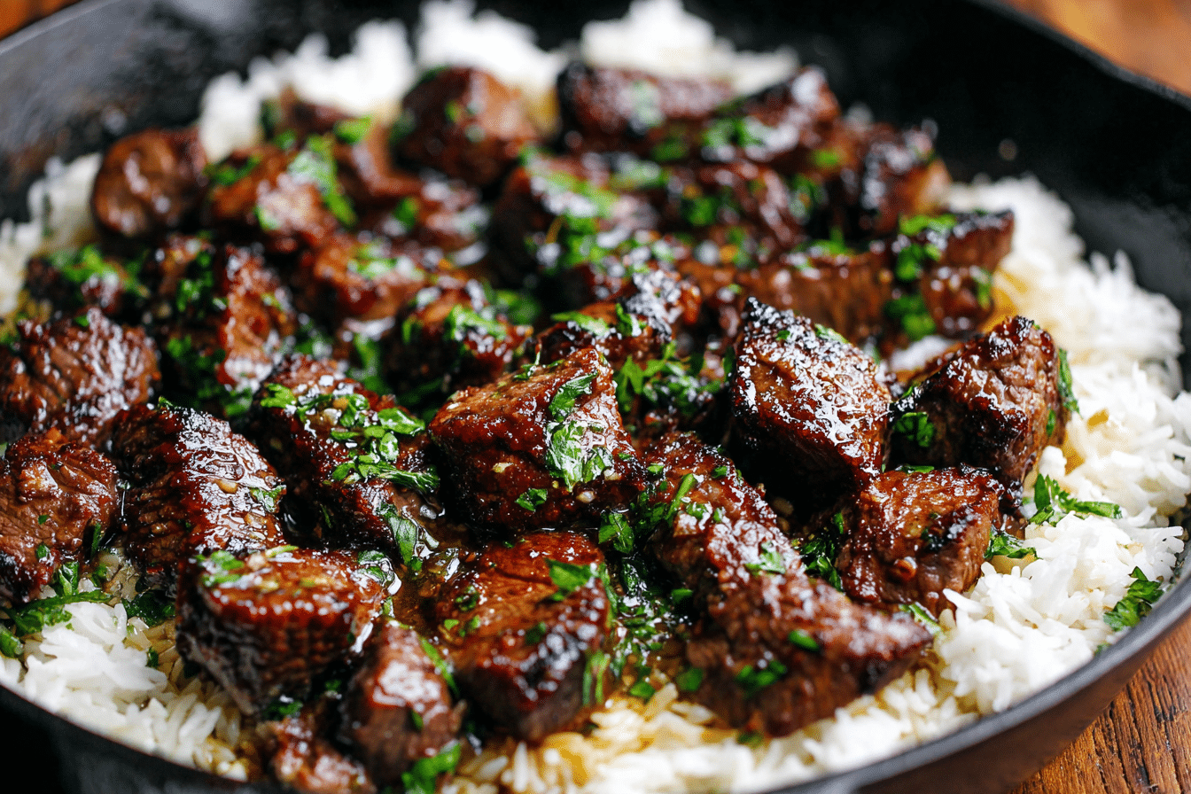 Tender steak bites glazed in a sticky honey garlic butter sauce, served over fluffy rice. A sweet, savory, and satisfying skillet meal perfect for weeknights.