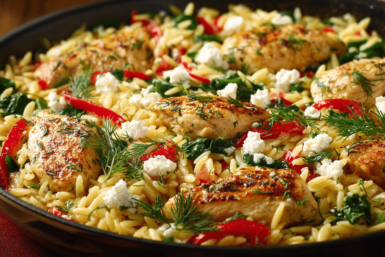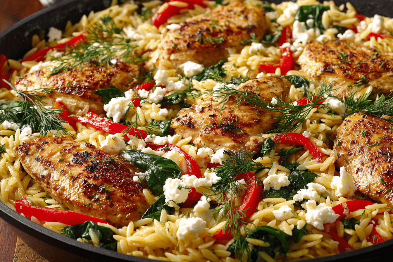 A vibrant Mediterranean one-skillet meal with juicy lemon-marinated chicken, tender orzo pasta, wilted spinach, and creamy crumbled feta.