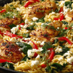 Lemon-Feta Chicken and Orzo is a Mediterranean-inspired dish that captures the essence of sun-soaked coastal cuisine in one flavorful skillet. Tender chicken breast is seasoned with herbs and citrus, seared until golden, and then nestled into a bed of orzo pasta infused with lemon juice, garlic, and crumbled feta. The result? A vibrant and balanced dinner that feels both comforting and fresh.