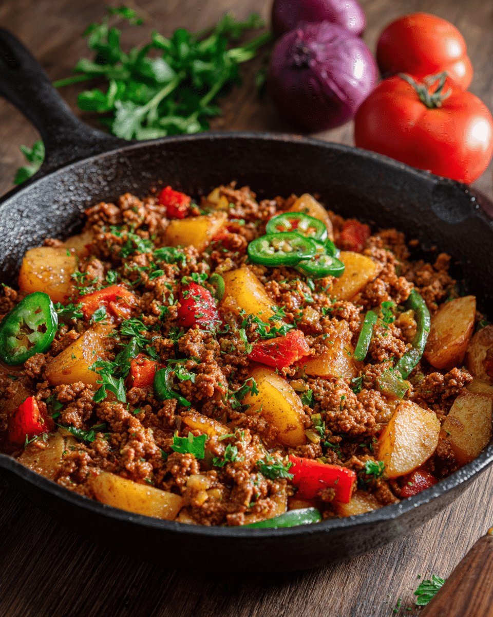 Mexican Picadillo is a one-skillet ground beef dish simmered with potatoes, tomatoes, and spices. Easy, comforting, and packed with bold flavors—perfect for tacos, rice bowls, or weeknight meals.