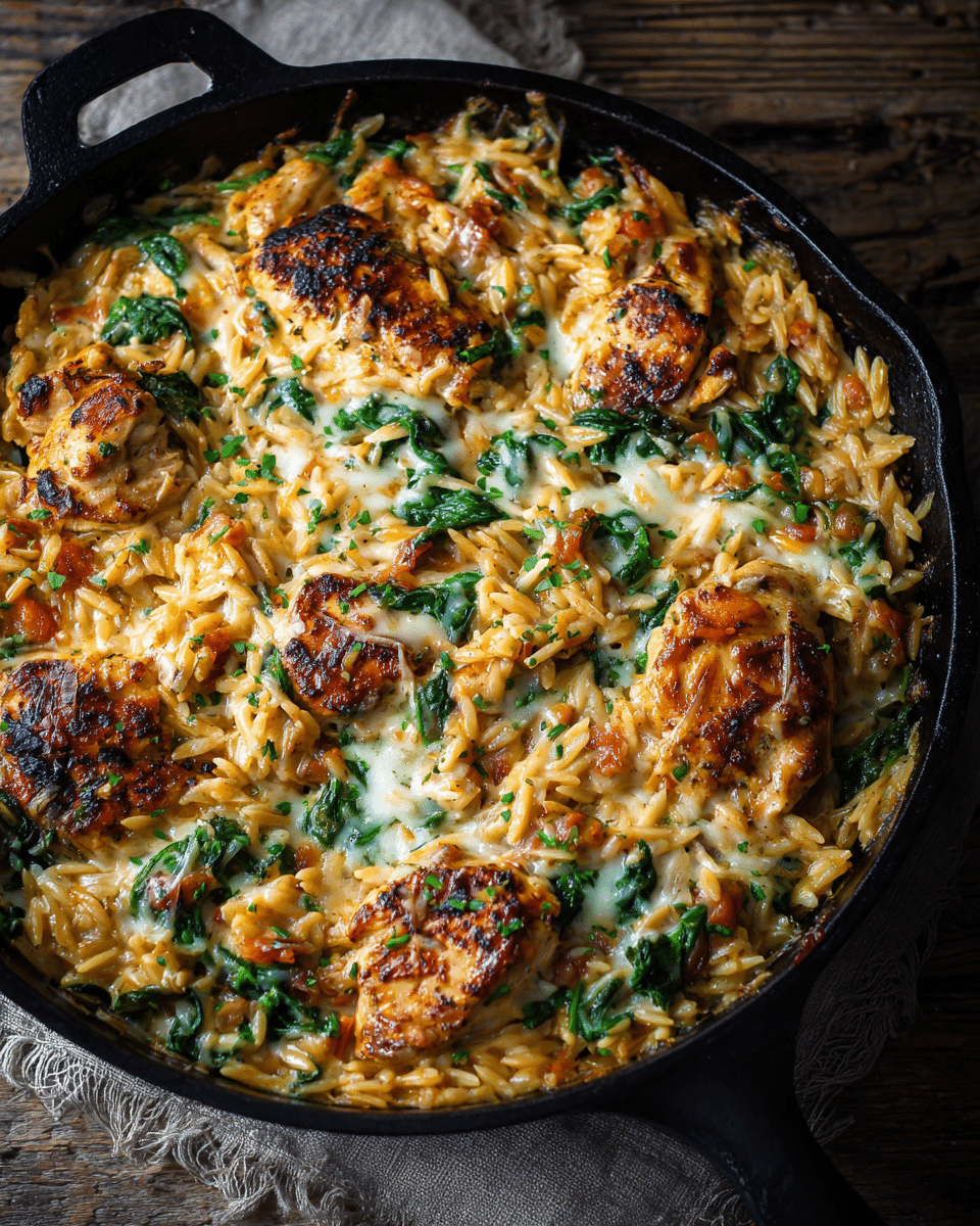 This one-pan wonder has it all: juicy chicken, smoky bacon, sweet tomatoes, and melty Monterey Jack cheese stirred into buttery orzo. It’s deeply satisfying, easy to customize, and comes together in about 30 minutes with no boiling or draining needed.