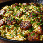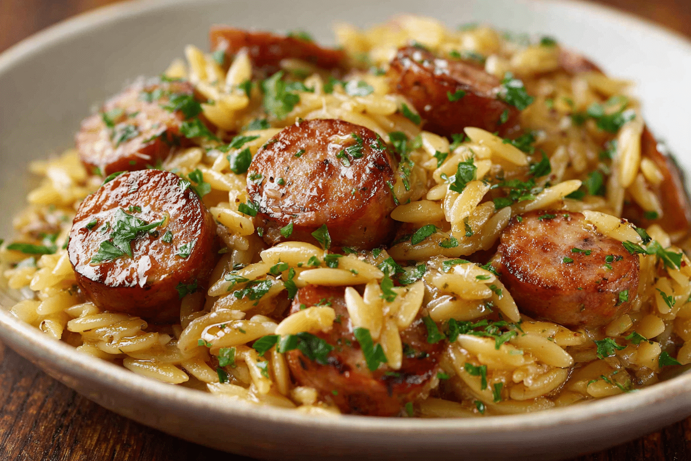 A rich, buttery one-pot meal made with garlic, smoked sausage, and tender orzo pasta in a creamy Parmesan sauce. Perfect for a cozy dinner in 30 minutes.