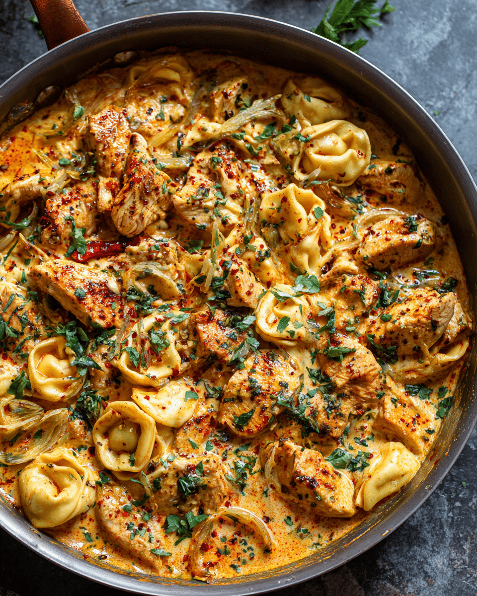 This recipe combines the richness of garlic butter with the satisfying chew of cheese-filled tortellini, made even more exciting with a spicy kick from crushed red pepper. It’s fast, family-friendly, and packed with layers of texture—from creamy sauce to tender chicken and pillowy pasta. Even better? Everything comes together in just one pot, making cleanup a breeze.