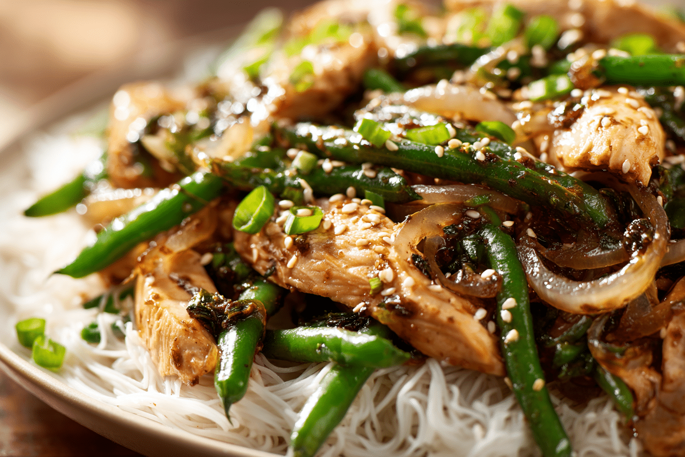A light, flavorful stir-fry with tender chicken breast, crisp green beans, and onions in a savory garlic-ginger sauce — a homemade version of the Panda Express favorite.