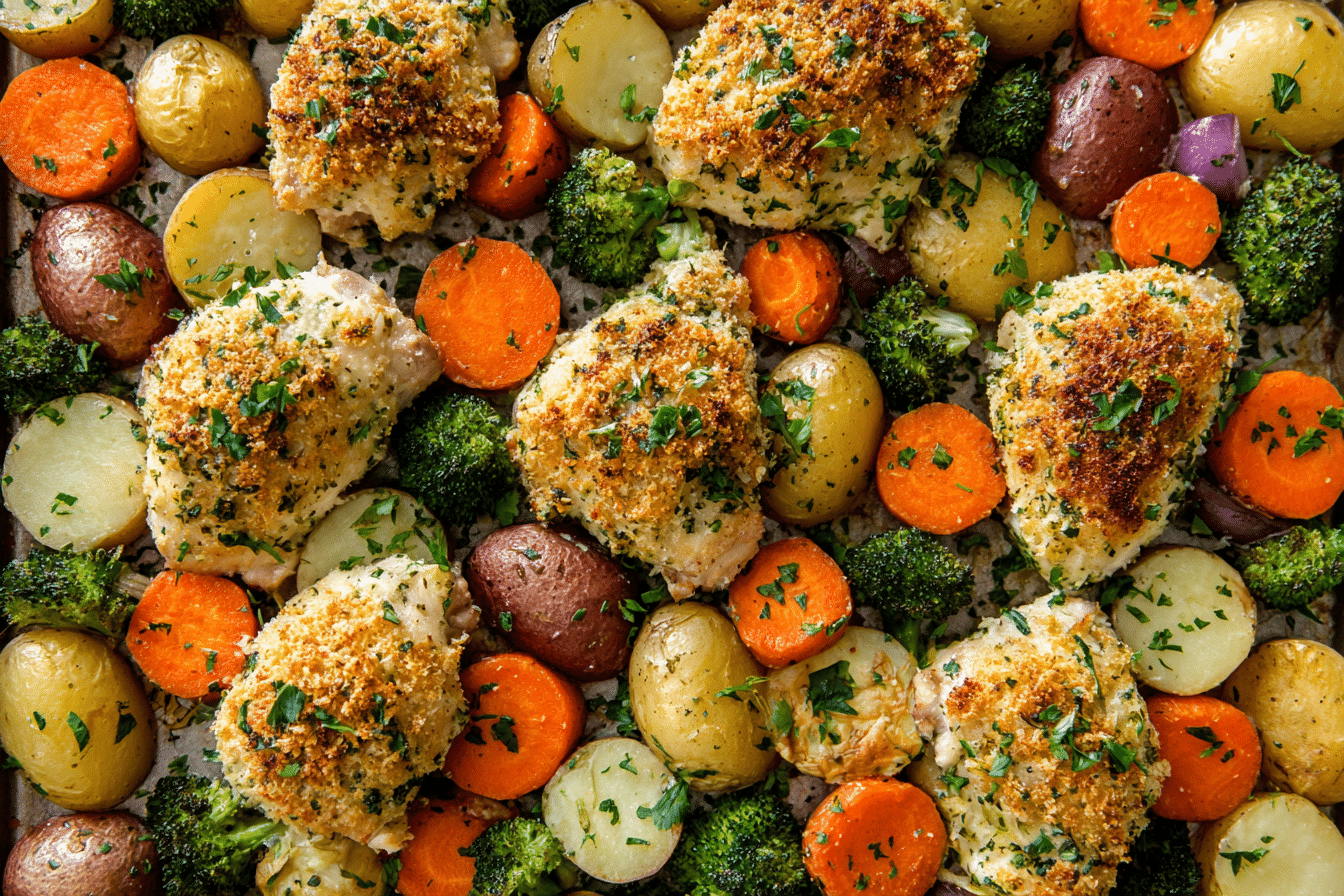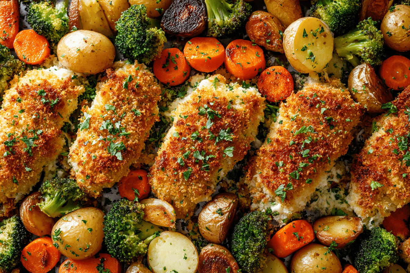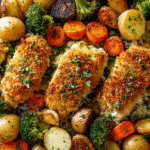 Parmesan Crusted Chicken Sheet Pan Dinner is a cozy, weeknight favorite that combines crispy chicken with golden, roasted vegetables — all cooked together on one pan. This recipe brings out the best in simple ingredients: juicy chicken breasts, a crunchy parmesan coating, and perfectly caramelized veggies, all kissed by the oven’s dry heat.