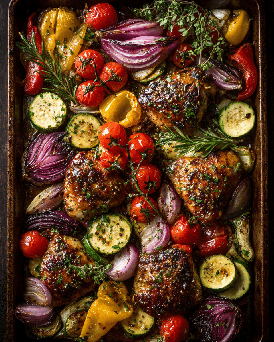 A juicy, herby, and sweet-savory chicken sheet pan dinner made with balsamic glaze and roasted vegetables. Perfect for busy nights or meal prep.