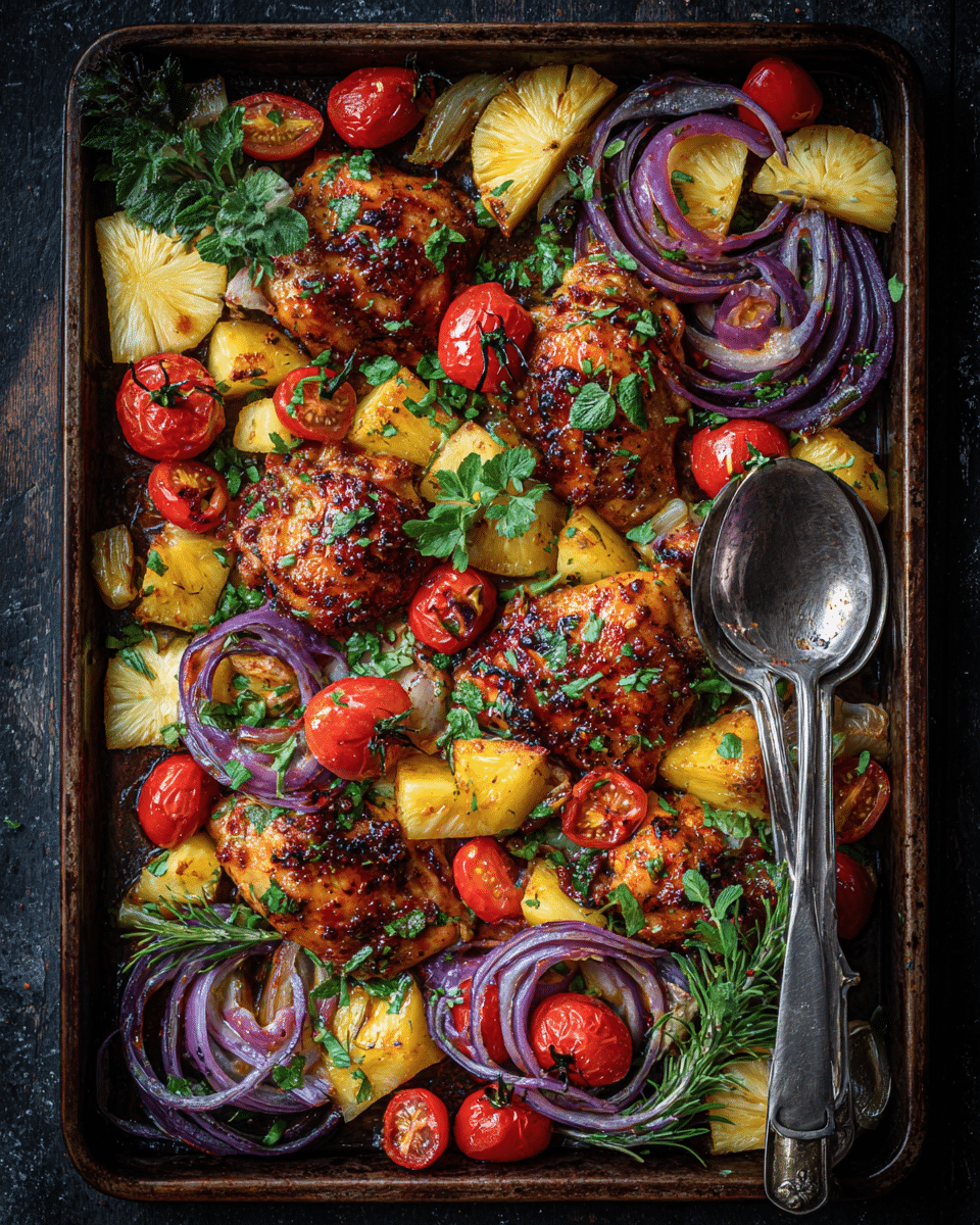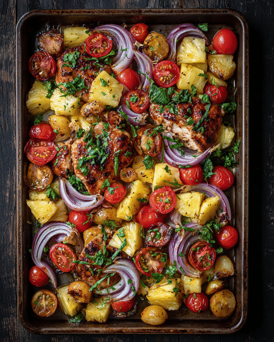 A vibrant, one-pan chicken dinner featuring sweet pineapple, colorful peppers, and a sticky-salty Hawaiian-inspired sauce, all roasted to perfection.