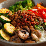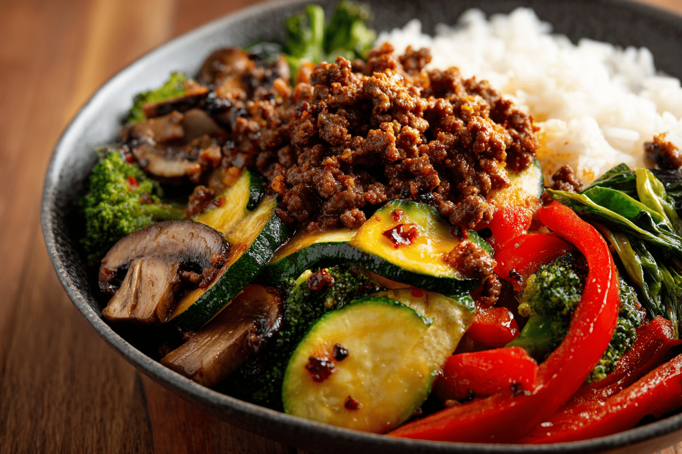 This Spicy Ground Beef Stir-Fry Bowl features bold, umami-rich flavors with chili heat, crisp veggies, and tender beef — ready in under 30 minutes for a quick and hearty dinner.